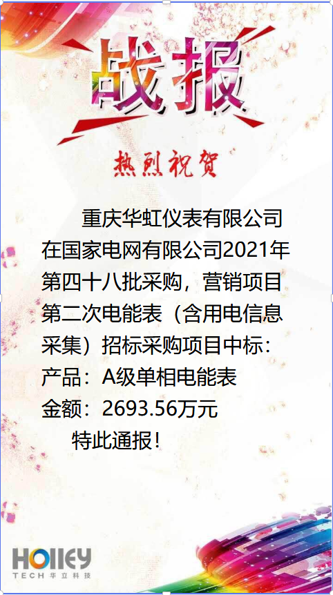 2021年11月23日,在國家電網(wǎng)組織實(shí)施的2021年營(yíng)銷(xiāo)項目第二次電能表招標采購項目招標中,重慶華虹儀表有限公司一舉中標。